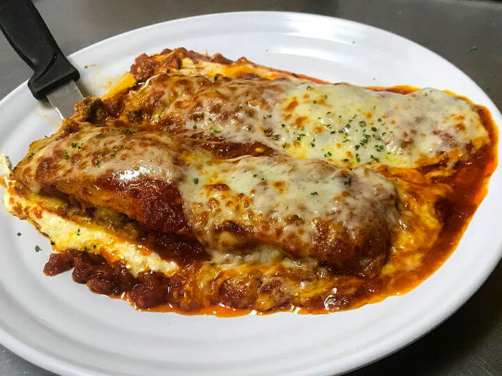 Layers of meat, ricotta, and mozzarella cheese topped with marinara and melted mozzarella